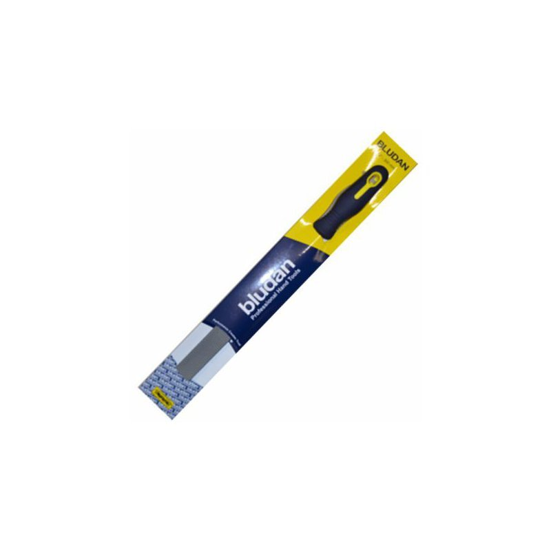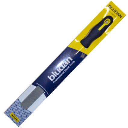 Kvalitná profesionálna plochá rašpľa BLU-DAN s pogumovanou ergonomickou rukoväťou.