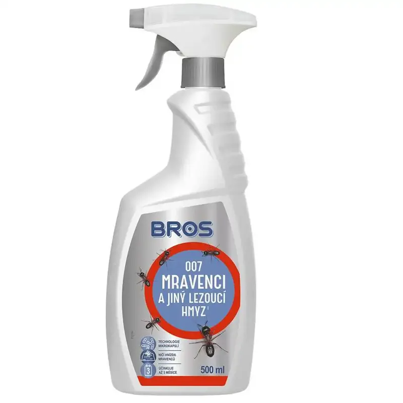 BROS Sprej 007 na mravce a iný lezúci hmyz je tekutý prostriedok s mikrokapsulami na likvidáciu mravcov a iného lezúceho hmyzu v exteriéri a interiéri. Účinná látka sa uvoľňuje postupne. Produkt sa aktivuje po 3-4 hodinách po aplikácii a je účinný najmenej 14 dní. Keď sa hmyz dostane do priameho kontaktu s prípravkom, mikrokapsule sa prilepia na jeho telo a tým sa prepravia do hniezda alebo na iné druhy hmyzu, ktorý neprišiel do priameho kontaktu s prípravkom. Tento mechanizmus fungovania (tzv. domino efekt) umožňuje eliminovať celú populáciu hmyzu.