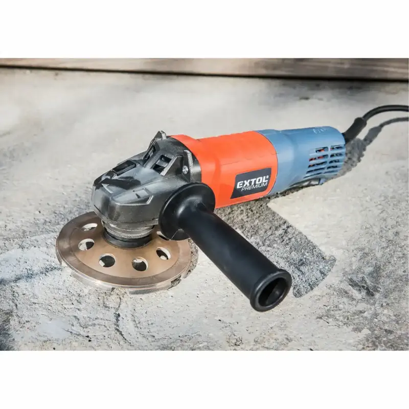 Parametre: príkon 900W priemer 125mm voľnobežné otáčky 11000minŻ1 polohovateľná rukoväť vreteno M14 dĺžka prívodného kábla 2m hmotnosť 2,0kg rukoväť, kľúč, náhradná sada uhlíkov