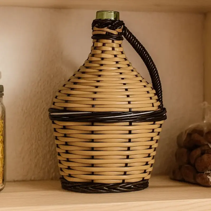 Opletaný demižón s korkovou zátkou je praktická nádoba na skladovanie a prenášanie tekutín. Ochranné opletenie zlepšuje manipuláciu a chráni povrch demižóna, zatiaľ čo prírodná korková zátka zabezpečí spoľahlivé uzavretie. Ideálna voľba pre každého, kto hľadá odolný a estetický demižón na víno alebo liehoviny.