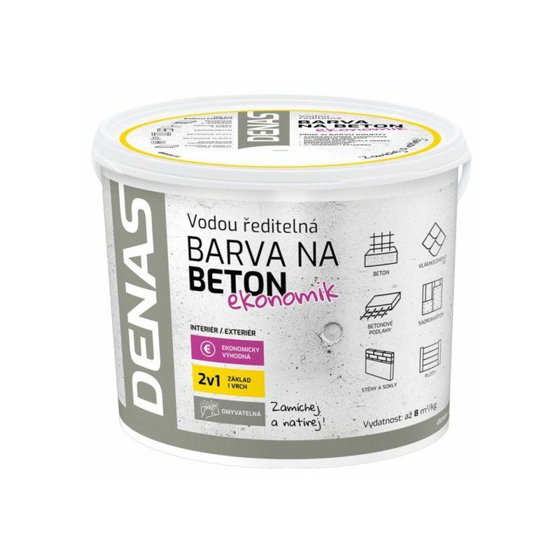 DENAS NA BETÓN EKONOMIK je vrchná krycia pochôdzna vodou riediteľná farba na betón v ekonomicky výhodnej kvalite určená na nátery betónových plôch, najmä podláh v interiéri s miernou záťažou, betónových stien, sadrokartónu, soklov, plotov, konštrukčných betónových prvkov, stropov , kde je vyžadovaná mierna až stredná záťaž. Náter má dobrú mechanickú odolnosť, umývateľnosť, paropriepustnosť, dobre sa udržuje. Farba má vynikajúce aplikačné vlastnosti, rýchlo zasychá. Natreté povrchy sú pochôdzne už po 12 hodinách, po 24 hodinách je možné povrch postupne zaťažovať. Plného vytvrdnutia náter dosahuje po 10 dňoch. farba nie je vhodná na nevyzretý betón.