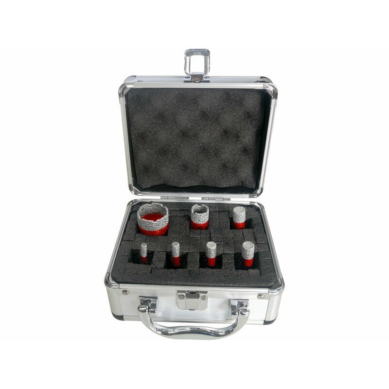 Diamantové vykružovacie korunky sú výborným nástrojom na vŕtanie otvorov do rôznych stavebných materiálov ako je dlažba, obklad, keramika, sklo, či pórobetón. S výškou pracovnej časti pokrytej diamantom 15mm poskytujú spoľahlivý výkon a precízne výsledky. Vďaka premyslenej konštrukcii je možné používať korukny aj bez chladenia vodou, čo zvyšuje ich univerzálnosť a pohodlie pri práci. Vŕtacie diamantové korunky sú dodávané v praktickom hliníkovom kufríku, čo zabezpečuje ich bezpečné prenášanie a skladovanie. Určené sú pre použitie s uhlovou brúskou.