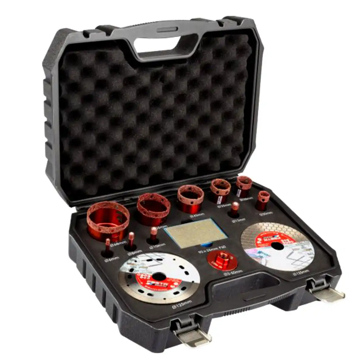 Vďaka možnosti „suchého“ aj „mokého“ vŕtania a vykružovania si poradíte aj s extrémne tvrdými materiálmi, ako sú gres, mramor, žula či tvrdé dlaždice. Nástroje majú diamantovú vrstvu s výškou 10 mm, menšie diamantové zrná s vyššou hustotou a integrovaný chladenie voskom alebo otvormi, čo zaisťuje rýchlejšie vykružovanie a dlhšiu životnosť. Sada je kompatibilná s uhlovými brúskami (závit M14) a s adaptérom aj s vŕtačkami či akuvŕtačkami.