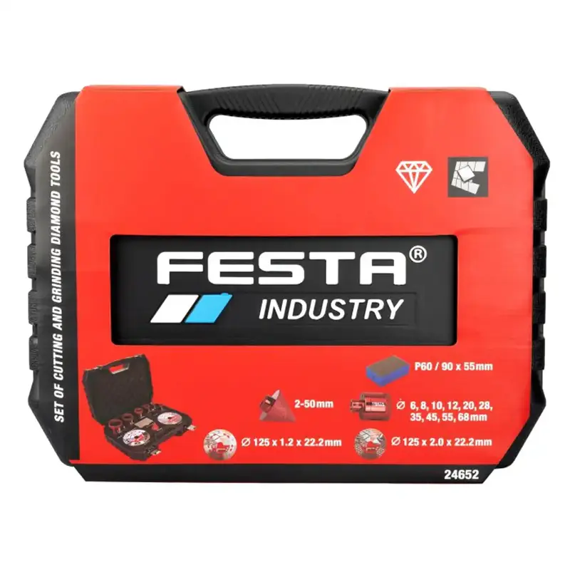 Diamantové vykružovacie korunky a rezné kotúče FESTA INDUSTRY sú dokonalým riešením pre profesionálne obkladačské práce a ďalšie náročné úlohy vo stavebníctve. Obsahuje vŕtacie a vykružovacie korunky s najpoužívanejšími priemermi, kužeľovú brúsnu korunku, diamantové rezné a brusné kotúče, ako aj diamantovú brusnú hubku na obklady a dlažby. S touto sadou ľahko vytvoríte otvory na uchytenie sprchových kútov, elektroinštalačné krabice, odpadové rúry či priechodky na vodu.