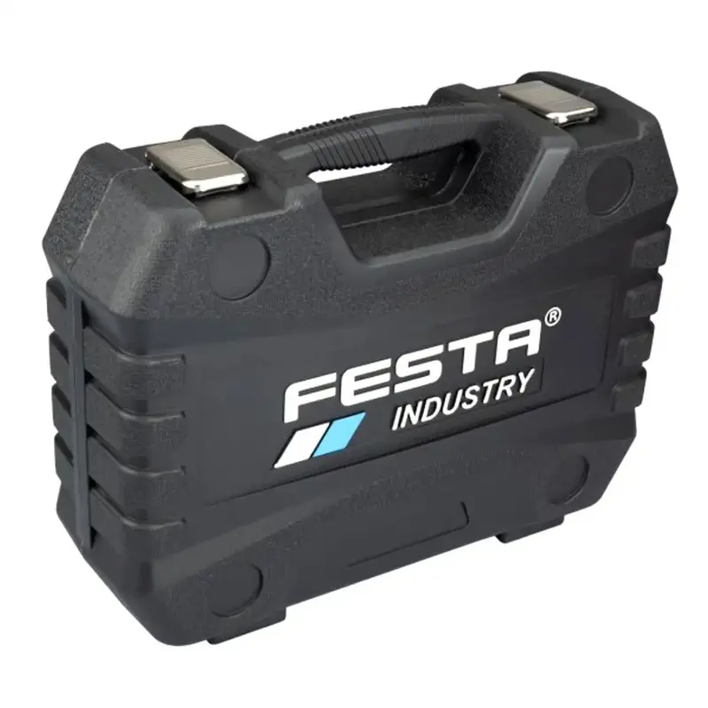 Odolný plastový kufrík s kovovými pántmi, zámkami a gumovou výstelkou umožňuje bezpečné uloženie a pohodlný prenos nástrojov. FESTA INDUSTRY predstavuje spoľahlivosť a profesionálnu kvalitu, ktorú ocení každý odborník.