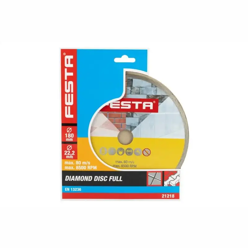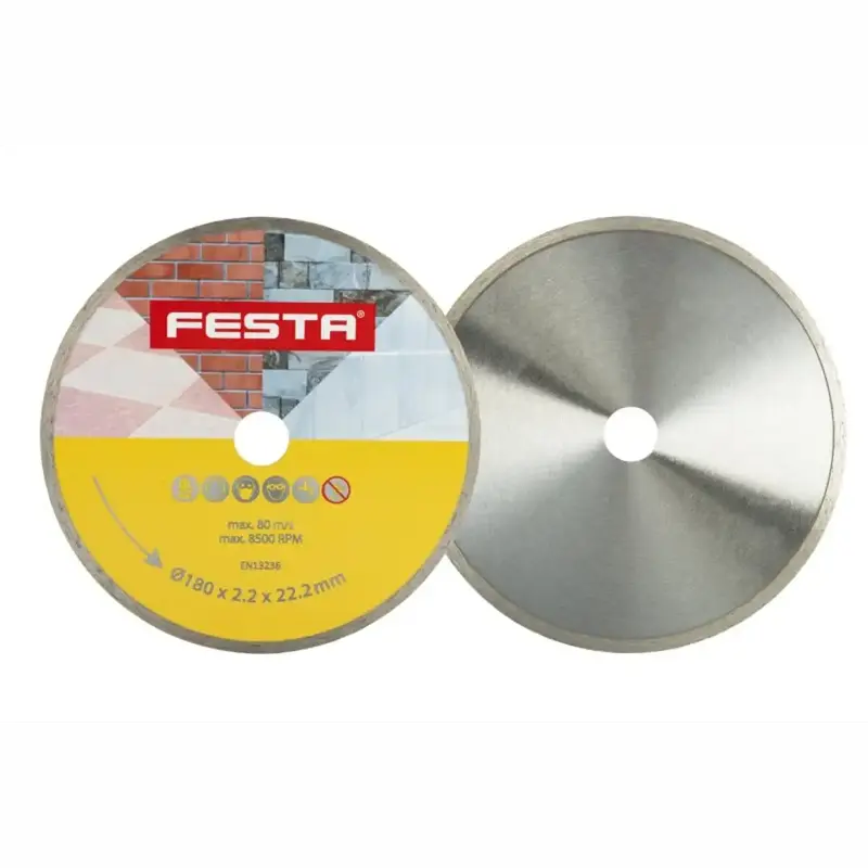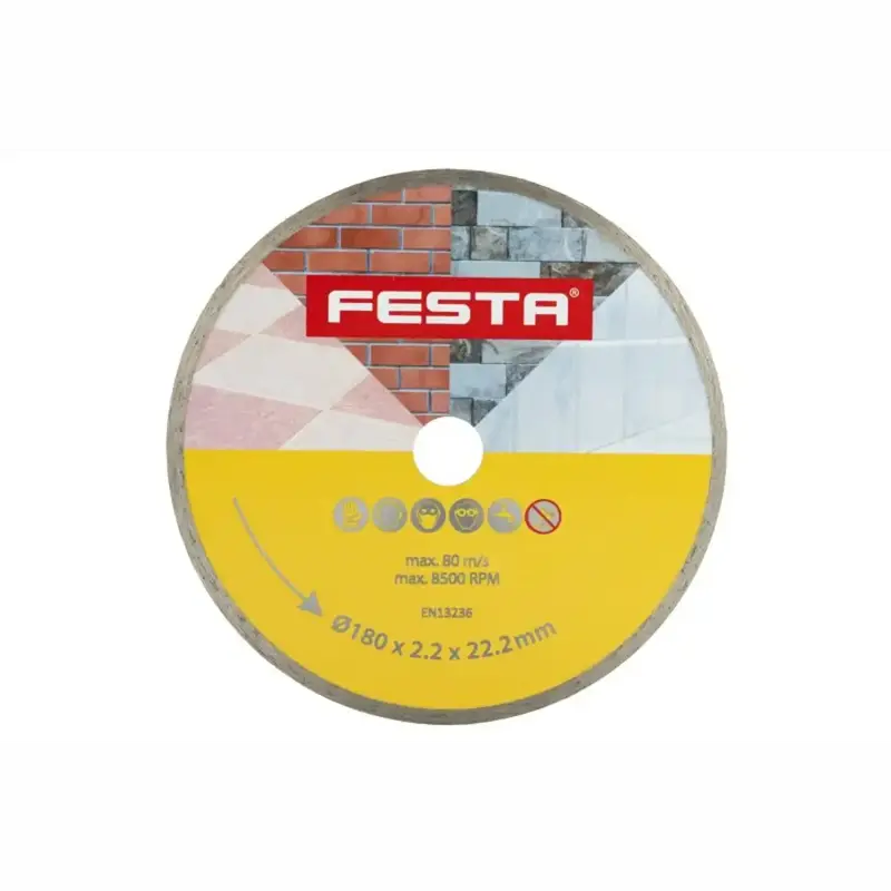 Profesionálny plný diamantový kotúč FESTA je určený na presné a čisté rezanie dlažby, obkladov a ďalších stavebných materiálov. Celoobvodový plný veniec s kvalitnou diamantovou vrstvou s vysokým obsahom diamantového prachu zabezpečuje spoľahlivý výkon pri mokrom aj suchom rezaní betónu, tehál, muriva, žuly, mramoru, kameňa, skla a keramiky.