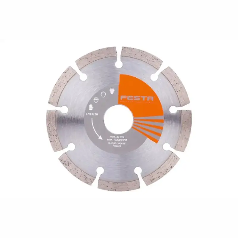Profesionálny diamantový segmentový kotúč FESTA je určený na suché rezanie betónu, tehál, muriva a kameňa. Vďaka kvalitným materiálom, vysokému obsahu diamantového prachu v segmentoch a pevnému uchyteniu segmentov k nosnému disku ponúka presný rez a dlhú životnosť pri každodennom stavebnom nasadení.