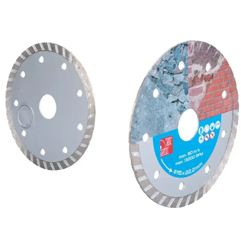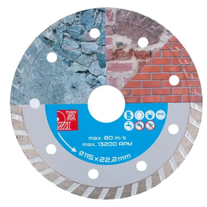 Špeciálny turbo tvar diamantových segmentov zabezpečuje agresívny záber a plynulý rez, čo skracuje čas práce a zvyšuje produktivitu pri rezaní betónu, tehál, muriva a kameňa.
