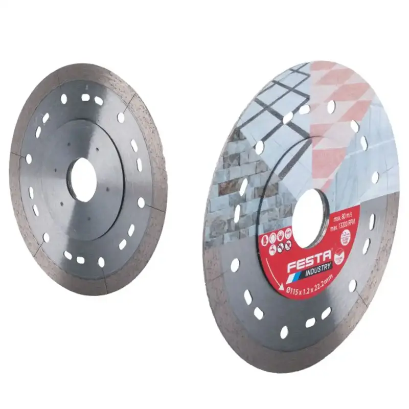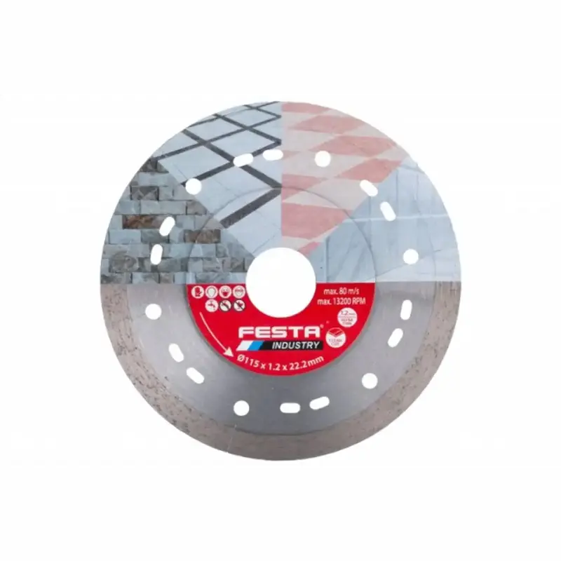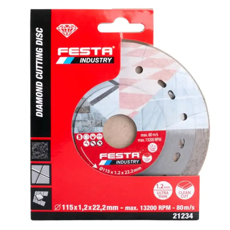 Tenký plný diamantový kotúč FESTA Industry je špeciálne navrhnutý pre precízne rezanie keramických obkladov, dlažieb, skla a glazovaných povrchov. Jeho úzky profil a diamantové ostré hrany umožňujú jemné a presné rezy bez rizika poškodenia materiálu. Kotúč je určený pre použitie s uhlovými brúskami. Diamantový kotúč je neoceniteľným nástrojom pre profesionálnych remeselníkov aj domácich kutilov. S vysokou odolnosťou a výkonnosťou umožňuje rýchle a presné spracovanie odolných materiálov, čím zaručuje dokonalé výsledky pri rezaní citlivých a náročných povrchov.