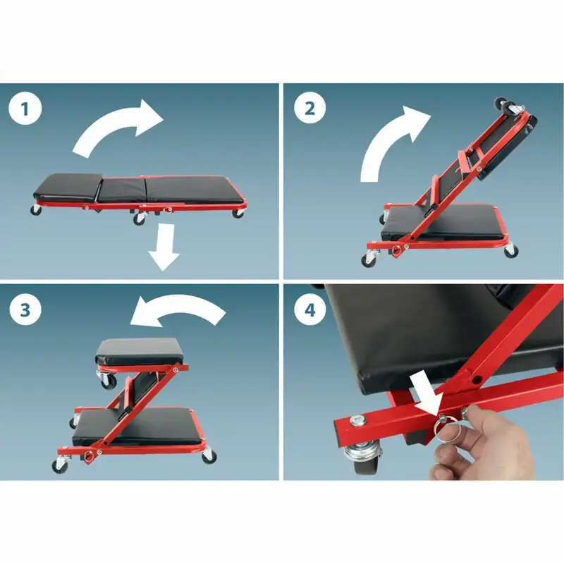 Konštrukcia je navrhnutá tak, aby ste výrobok vedeli používať ako pojazdné montážne ležadlo alebo ako dielenský sedák podľa potreby.