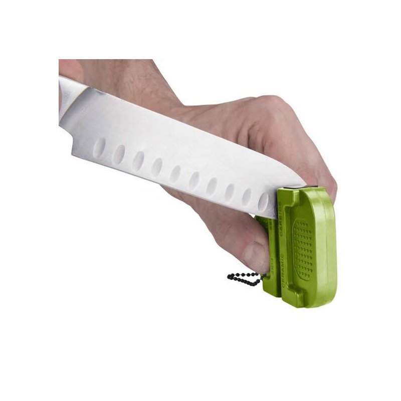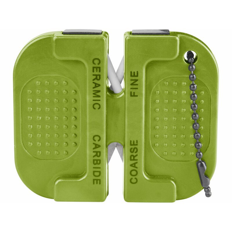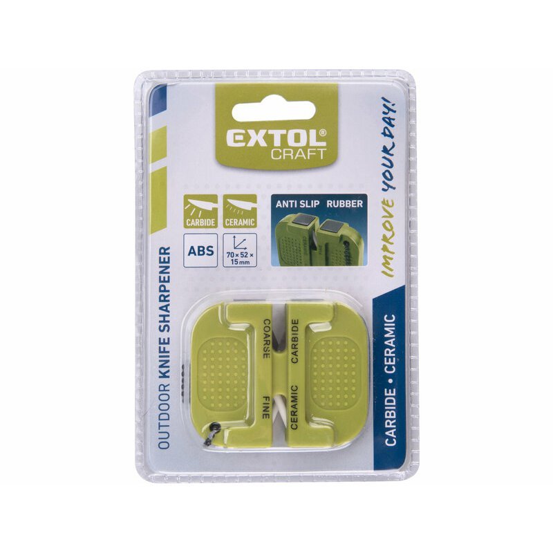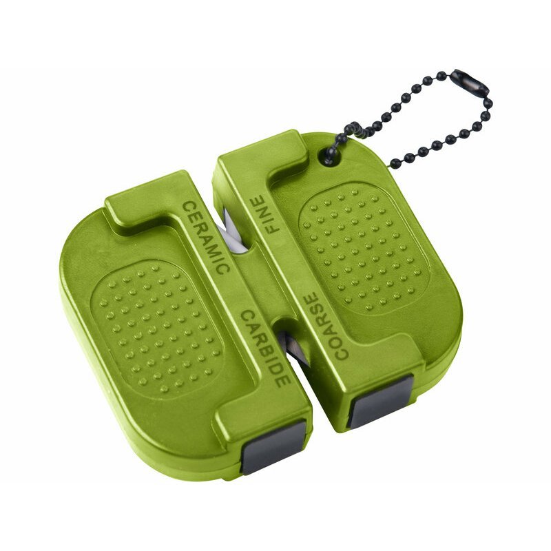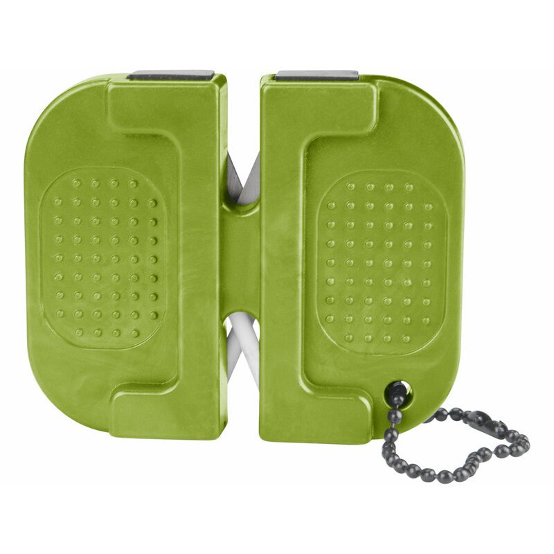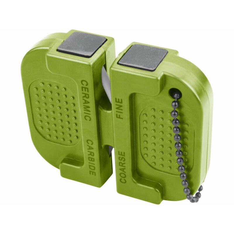 Závesná brúska na nože s retiazkou EXTOL Craft. Malá outdoorová brúska na nože s retiazkou pre hrubé brúsenie pomocou dvojice karbidových plátkov a jemné doostrenie pomocou keramických valcov