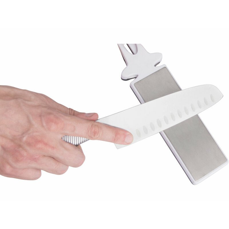 na rukoväti sú z jednej strany dva karbidové ostriace plátky pre brúsenie "nahrubo", z druhej keramické valce pre jemnejšie doostrenie