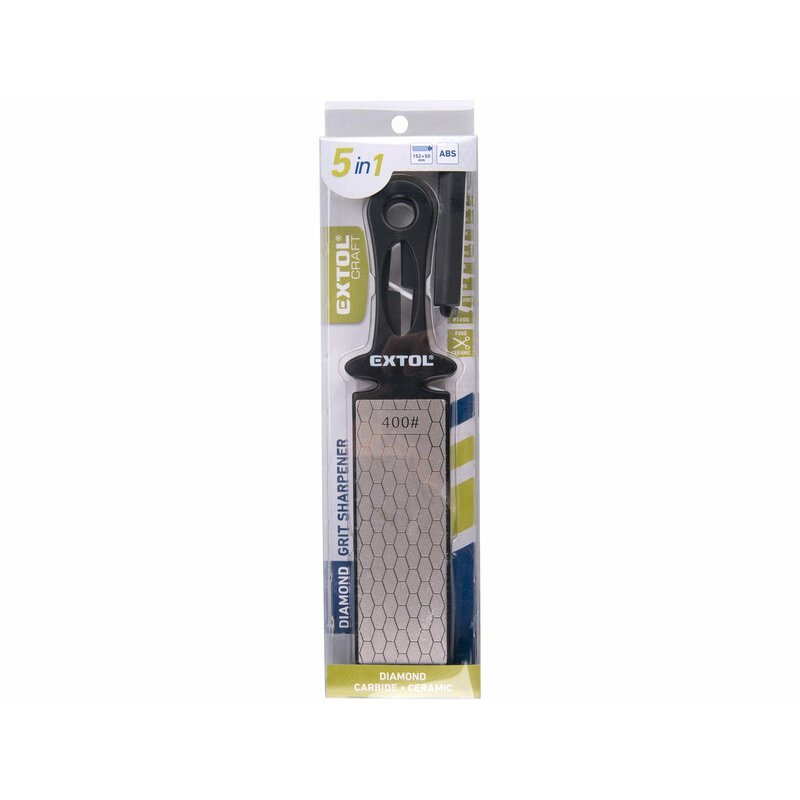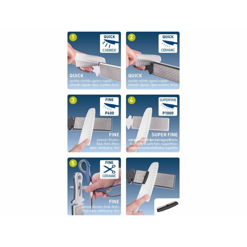 obojstranná brúsna doska 152x50mm s diamantovým prachom zrnitostí P400/P1000 a plastovo-keramickým vodítkom, ktoré pri brúsení pomáha udržať konštantný sklon čepele noža voči brúske