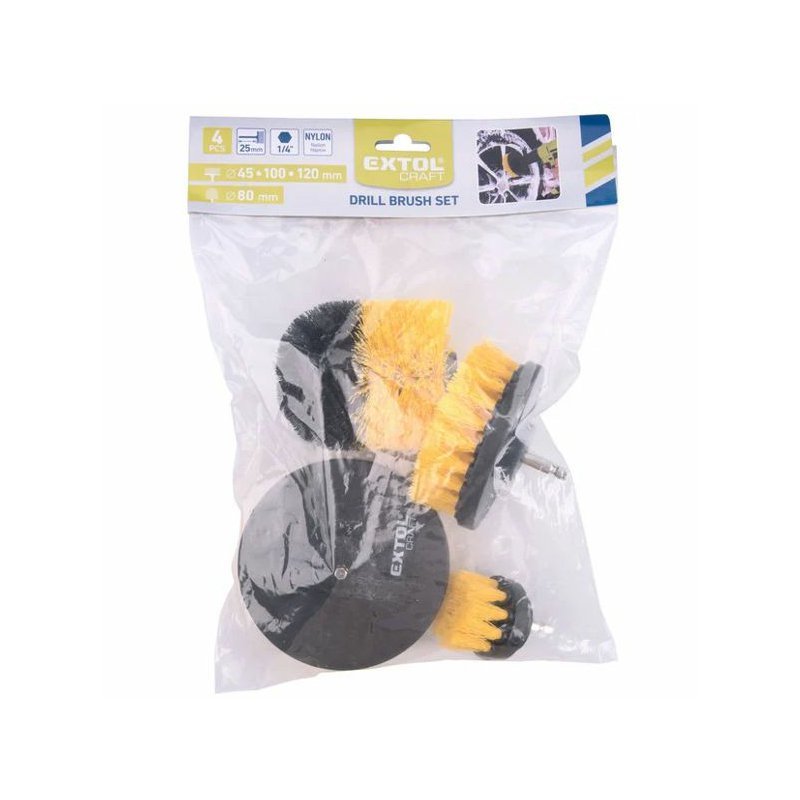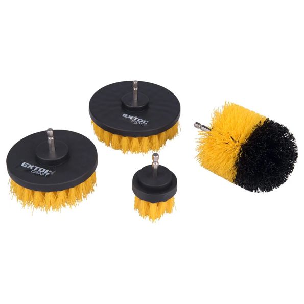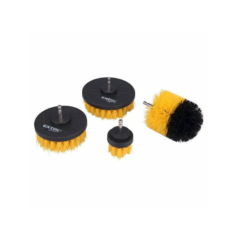 Čistiace kefky EXTOL Craft do vŕtačky so 1/4" stopkou, 4-dielna sada. Kefy sú vhodné na najrôznejšie čistiace práce v domácnosti a dielni, napr. na umývanie a údržbu kachličiek, dlažby, umývadiel a toalety, ale môžu byť aj dobrým pomocníkom pri umývaní bicyklov, vozidiel, záhradného nábytku, odstraňovanie zašlej špiny, mastnoty, prachu atď. z najrôznejších povrchov.