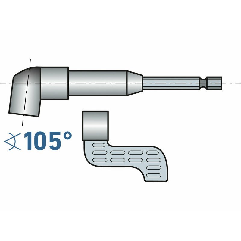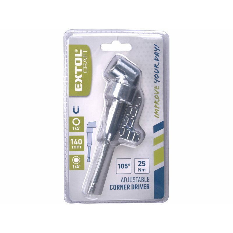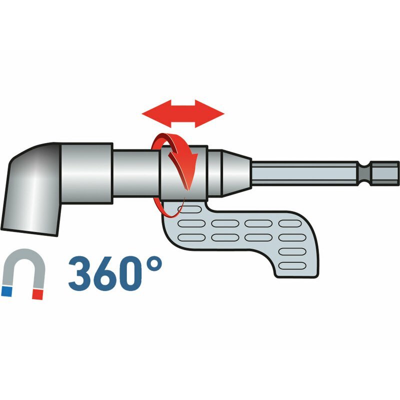 Praktický rohový magnetický nadstavec EXTOL Craft na bity do vŕtačky alebo akumulátorového skrutkovača. Účinná pomôcka pre skrutkovanie v tažšie prístupných miestach. Súčasťou je prídavná rukoväť - krídlo je možné nastaviť a zaaretovať vo viacerých polohách.