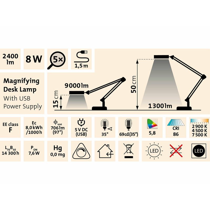 Stolová lampa LED EXTOL Light s lupou je špeciálny druh svietidla, ktoré sa používa všade tam, kde je potrebné lepšie osvetlenie a zväčšenie detailov. Lampa je veľmi užitočná pri práci s malými detailmi, ako je hodinárstvo, šitie, ručné práce alebo opravy elektroniky. Má lupu, ktorá zväčšuje objekty a umožňuje vám vidieť drobné detaily. Vhodná je tiež na dlhodobé čítanie kníh, novín alebo časopisov, a písanie drobného textu pretože poskytuje dostatočné osvetlenie a zväčšenie textu, čo zabezpečuje lepšiu čitateľnosť a menšiu námahu zraku. Svoje uúplatnenie nájde aj pri kozmetických procedúrach a úpravách, ako je líčenie, očná maskara, úprava nechtov alebo depilácia. Pre umelcov a modelárov je táto lampa skvelým nástrojom na detailnú prácu. Stolová lampa EXTOL Craft kombinuje silné LED osvetlenie s lupou, čo je praktické a pohodlné riešenie pre detailné práce a činnosti vyžadujúce zvýšené svetlo a zväčšenie.