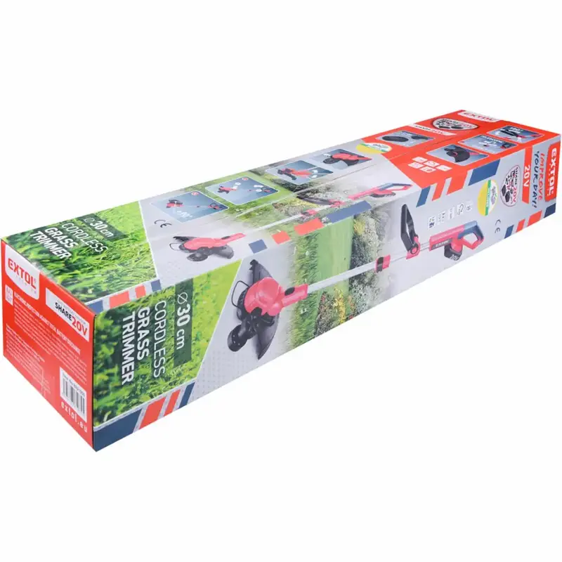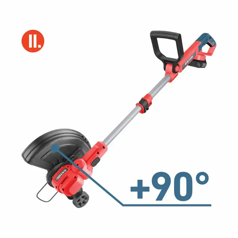 Akumulátorová strunová kosačka EXTOL PREMIUM Share20V je ľahký a obratný vyžínač na údržbu trávnika, presné zarovnanie okrajov a kosenie v ťažko dostupných miestach. Ponúka šírku kosenia 30 cm, nastaviteľnú žaciu hlavu, otočenie rukoväti o 90° pre “edge” orez a pohodlnú teleskopickú rukoväť. Súčasťou výrobku je 2,0 Ah batéria a 2,4 A nabíjačka zo systému Share20V.