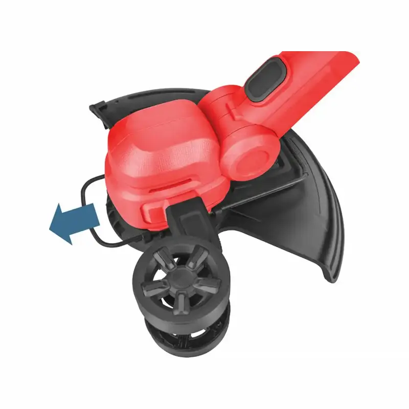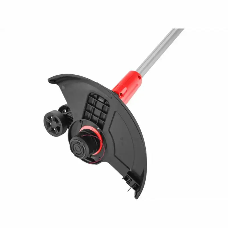 Vodiace koliesko uľahčuje vedenie popri plote či stene a dištančný oblúk chráni rastliny aj strunu počas práce.