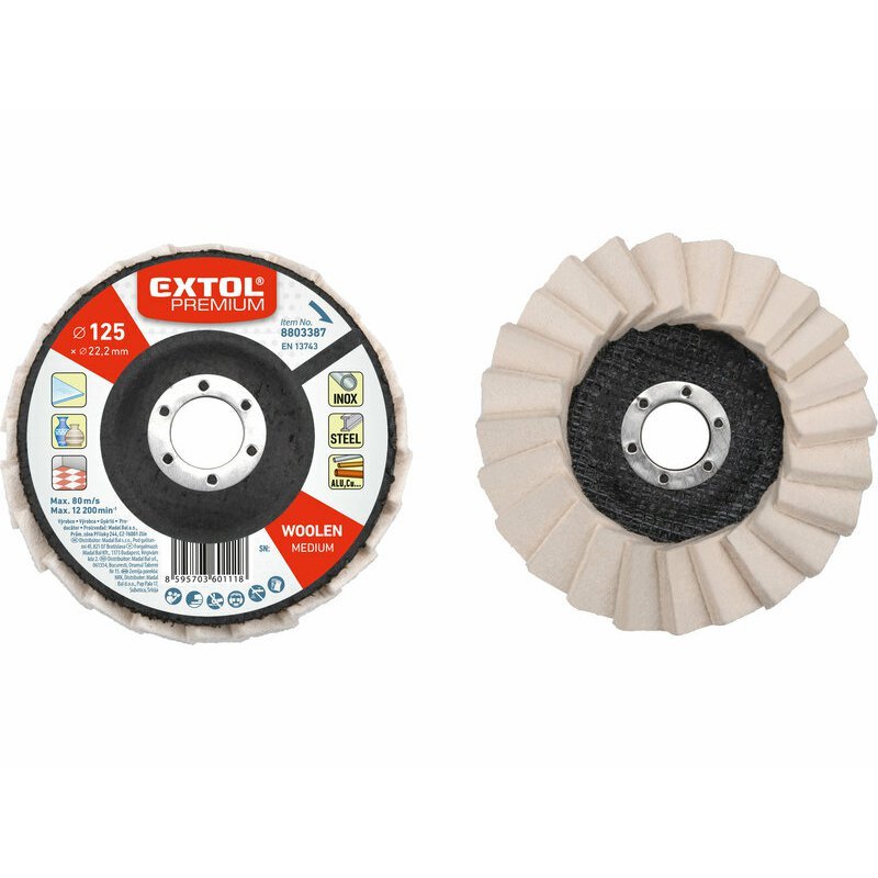 Šikmý leštiaci lamelový kotúč EXTOL Premium sa používa na na leštenie antikoru, ocele, mäkkých neželezných kovov, keramických povrchov a skla. Stredne jemná plsť je vyrobená z prírodných vlnených vlákien. Lamely sú ukotvené na sklotextilný unášací disk.
