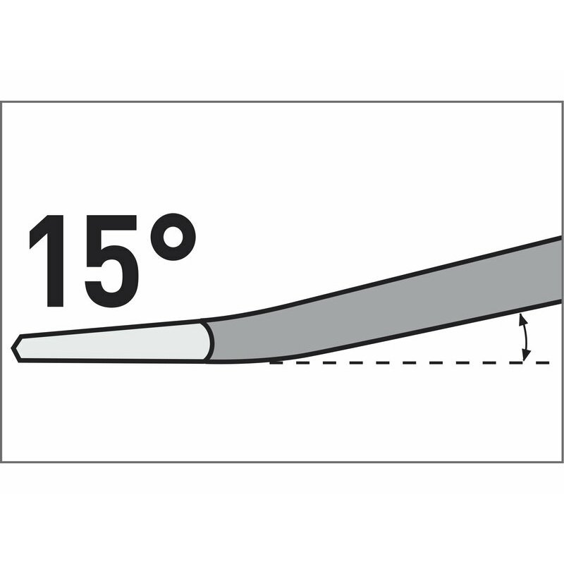 Zahnutý plochý sekáč EXTOL Premium SDS Plus, dĺžka 250mm. Plochá časť sekáča je zahnutá pod uhlom 15°, čo umožňuje jednoduchšiu prácu pozdĺž steny, alebo podlahy, napr. pri odstraňovaní starej omietky, dlažby, obkladu a pod.
