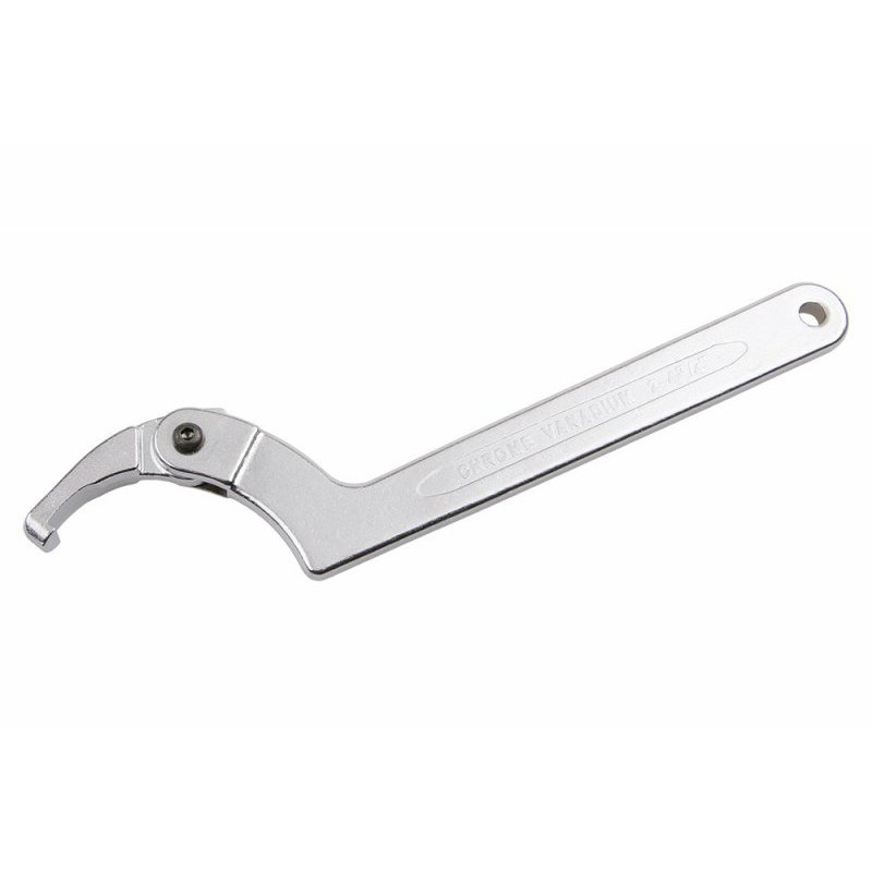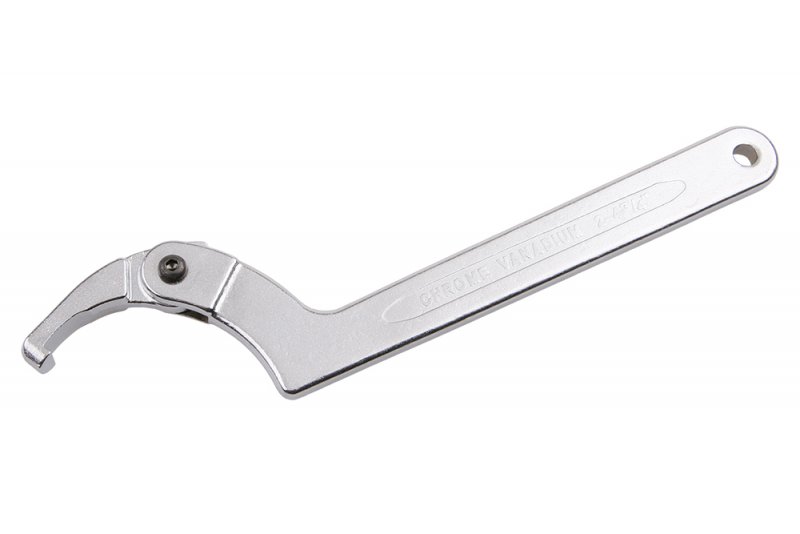 Nastaviteľný hákový kľúč pre goliere, krúžky a ložiská. Jediná čeľusť s upínacím kolíkom v priemyselnej povrchovej úprave. Pri používaní zaistite presné nasadenie háku čeľuste. Prevedenie: matný chrómovaný povrch, kovaný, chróm-vanadiová oceľ.