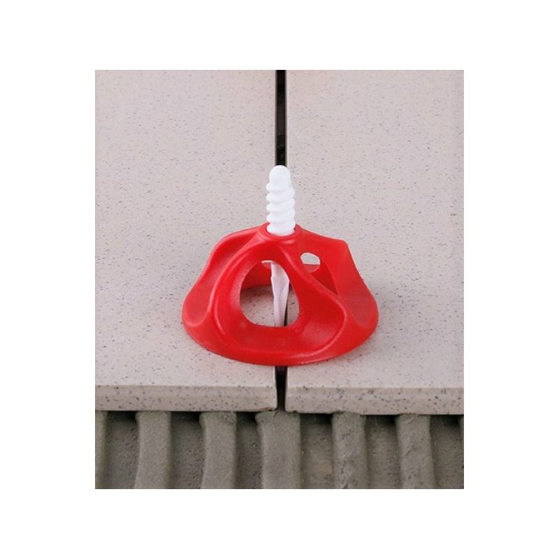 • nivelácia pomocou klobúčika zrovná dlaždice po zaschnutí sa horná časť spony s klobúčikom odstráni bielym gumeným kladivom alebo odkopnutím