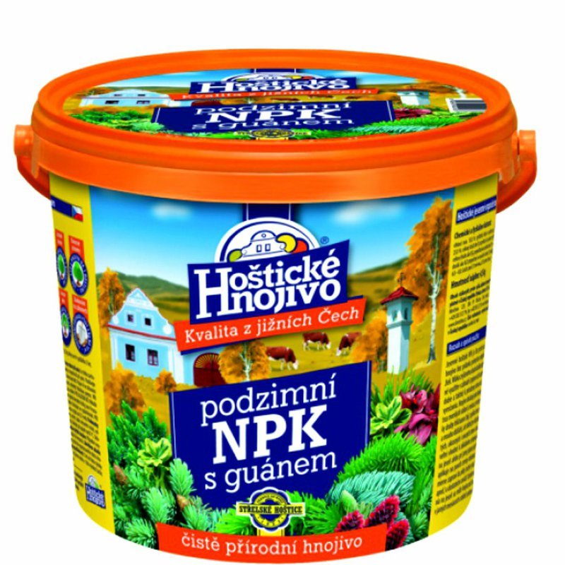 Jesenné hoštické organické Hoštické hnojivo NPK s guánom Rozsah a spôsob použitia: Jesenné hoštické hnojivo NPK je čisto prírodné organické hnojivo bez prídavku priemyslovo vyrobených zložiek. Vďaka zvýšenému obsahu draslíku má komplexné využitie v záhrade k príprave rastlín na zimné obdobie a taktiež k prirodzenej ochrane rastlín proti vy mŕzaniu. Hnojivo obsahuje guáno (mineralizovaný trus morských vtákov) a je vhodné pre všetky druhy ihličnanov (tují, cypriškov, borovíc, smrekov a mnoho ďalších), ale taktiež pre všetky druhy listnatých, okrasných i ovocných stromov a kríkov. Tiež je veľmi vhodné k základnému vyhnojeniu pôdy, buď na jeseň alebo pri jarnej príprave pôdy. Hnojivo sa aplikuje na povrch zeminy rozhodením a potom sa mierne zapraví do pôdy (ručným rytím, zahrabaním a pod.) a dostatočne zavlaží. V prípade nespotrebovania na jeseň sa môže hnojivo použiť univerzálne aj v jarných mesiacoch a taktiež v priebehu vegetácie.