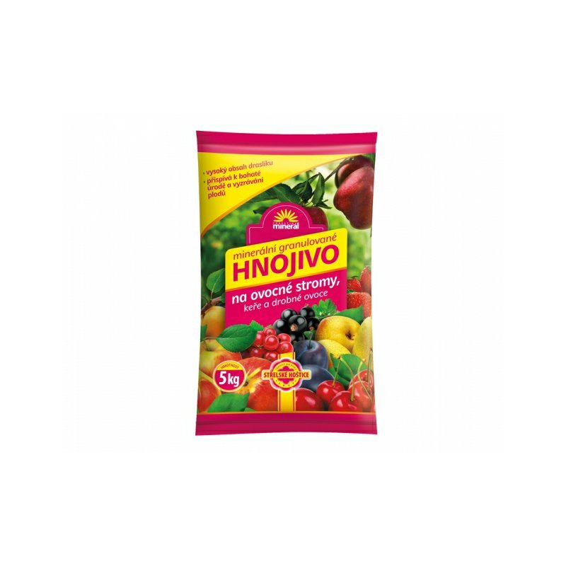 Granulované hnojivo na ovocné stromy a ďalšie drobné ovocie je vďaka svojmu vyváženému zloženiu určené k hnojeniu príslušných druhov na začiatku vegetácie a k ďalšiemu prihnojovaniu v priebehu vegetačného cyklusu. Vzhľadom k vyváženému obsahu základných živín a pomerne vysokému obsahu draslíka prispieva k bohatej úrode a dozrievaniu plodov, zlepšuje ich skladovatelnosť a zvyšuje odolnosť proti hnilobám. Zloženie: Minerálne hnojivo granulované 11%N+9%P205+12% K20+2% MgO Použitie: Doporučená dávka hnojiva sa rovnomerne rozhodí okolo pestovaného stromku, kríku a pod. a vhodným nástrojom sa ľahko zapraví do pôdy. Potom sa dostatočne zavlaží. Dávkovanie: Ovocné stromy 100-120 g na 1m2 Drobné ovocie: 60-80 g na 1m2 Hlavné termíny pre aplikáciu hnojiva: marec, apríl, máj, jún, júl, august, september