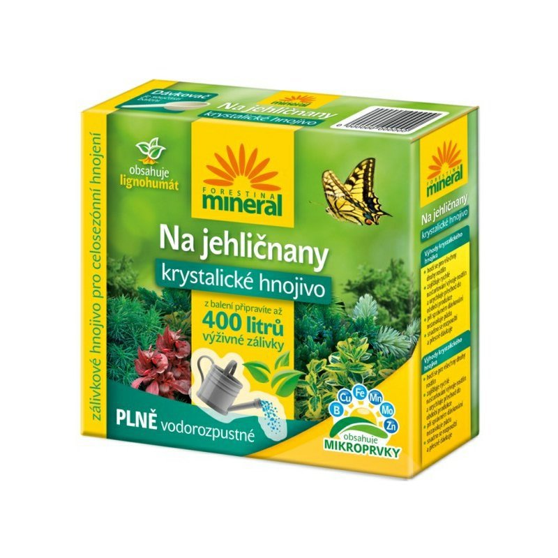 Kryštalické hnojivo Ihličnany 400g/12K, Forestina s lignohumátom Kryštalické hnojivo na Ihličňany a ostatné okrasné dreviny je vodou rozpustné hnojivo určené k výživa všetkých druhov okrasných drevín (listnaté, ihličnaté) a pre všetky kriky. Vďaka vyváženému zloženiu hlavných živín a mikroprvkov, ktoré sú pre rastliny prítomné v ľahko prijateľnej a vysoko účinnej forme, poskytuje rastlinám všetko potrebné k harmonickému vývoju a zdravému rastu. Zloženie: NPK (MgO, S) 17-5-20 (3-12) Použitie: Kryštalické hnojivo na Ihličňany a iné okrasné dreviny je možné aplikkovať ako klasickou zálievkou, tak i postrekom na listy. Pre zálievku nasypeme 20 g hnojiva (asi 1 odmerka) do 20 L vody, zamiešame a zalievame, pokiaľ nie je substrát celkom nasýtený (20 L hnojivovej zálievky aplikujte cca na 10 m2). Hnojenie zálievkou vykonávame v priebehu vegetácie (cce do konca augusta 1x za 14 dní. V prípade postreku na listy nasýpom roztok aplikujeme na listy rastlin. Postrek nevykonávame za priameho slnečného svitu - mohlo by prísť k popáleniu listov slnečnými paprskami.