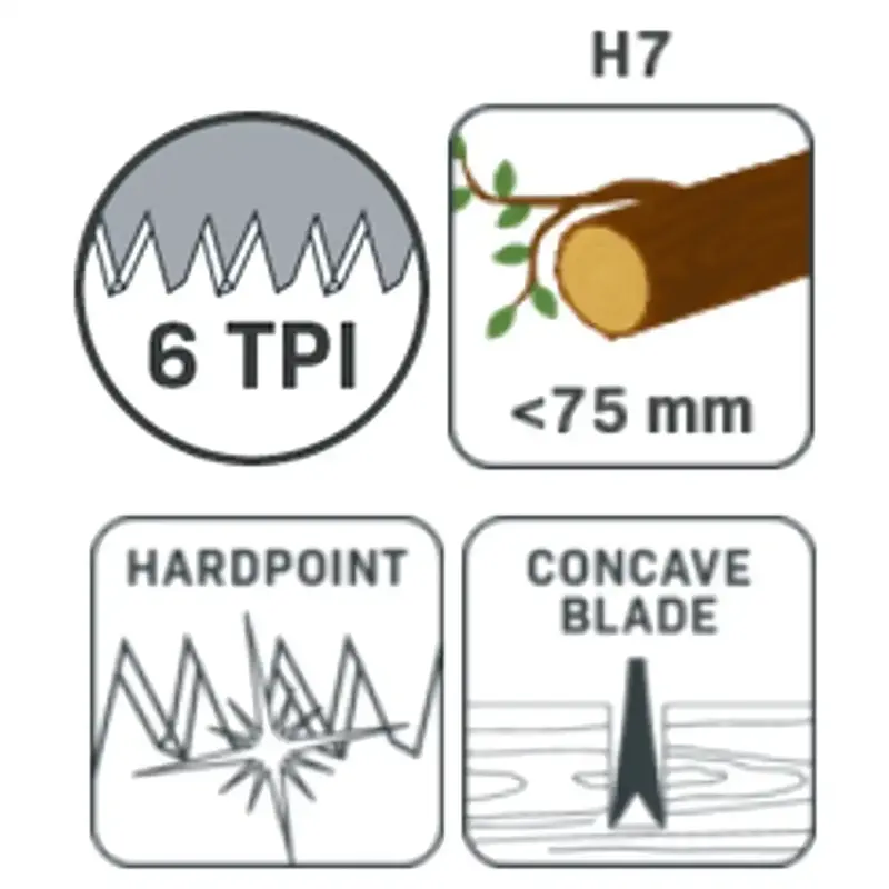Ozubený list so 6 zubami na palec je určený na rýchle rezanie čerstvého dreva. Kužeľovité brúsenie pomáha znižovať trenie a prispieva k hladšiemu reznému povrchu.