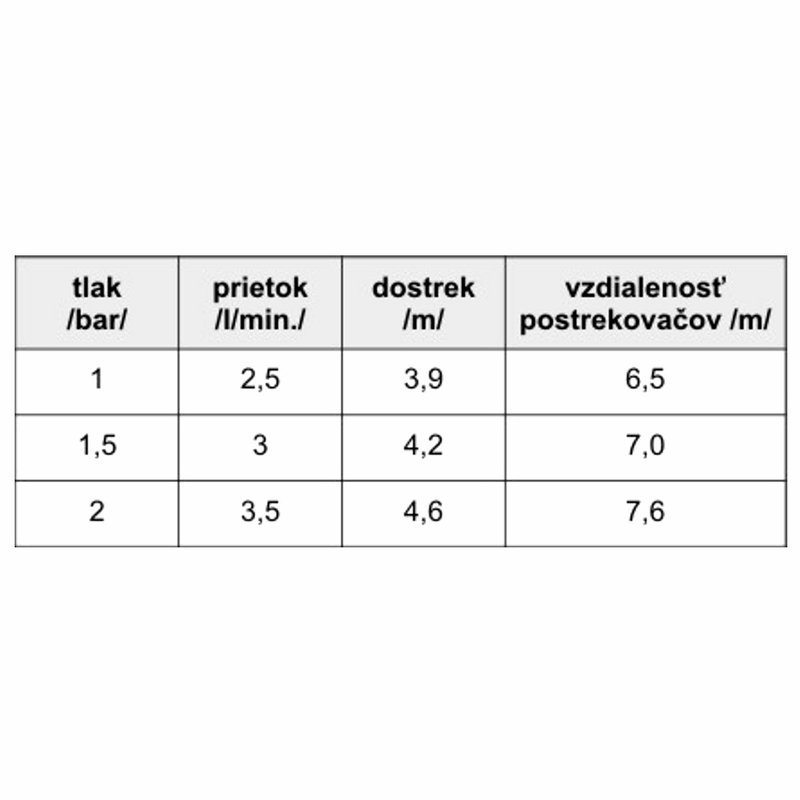• Nastaviteľný prietok a tlak pre rôzne potreby: Postrekovač funguje pri tlaku od 1 do 3 barov a ponúka variabilný prietok od 2,5 do 8 l/min, čím sa prispôsobí špecifickým požiadavkám rôznych rastlín a záhonov. Tento rozsah vám umožňuje presné nastavenie množstva vody, takže zavlažovanie je vždy efektívne a šetrné.