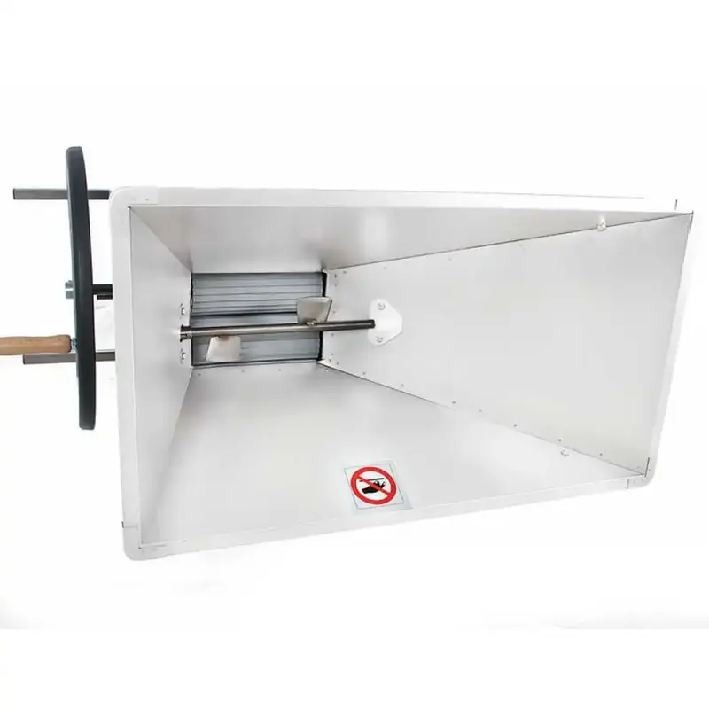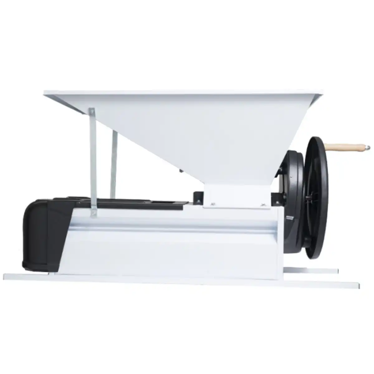 Široký biely lakovaný zásobník uľahčuje plynulé sypanie hrozna a priebežnú prácu bez zadrhávania.