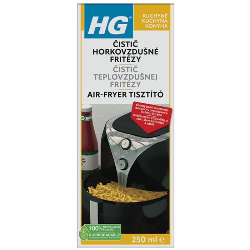 Pri používaní teplovzdušných fritéz sa často tvoria odolné usadeniny pripálenej mastnoty a zvyškov jedla. Čistenie fritéz je preto veľmi náročné, pretože tieto usadeniny sa takmer nedajú odstrániť ani najlepšími čistiacimi prostriedkami, odmasťovačmi alebo v umývačke riadu. HG čistič teplovzdušnej fritézy je jedinečný, patentovaný a mimoriadne účinný čistiaci prostriedok špeciálne vyvinutý na teplovzdušné fritézy. Účinne odstraňuje usadeniny, pričom je šetrný k fritéze a nepoškodzuje ju počas čistenia. Každý, kto niekedy varil v teplovzdušnej fritéze vie, že v nej možno jednoducho pripraviť chutný pokrm. Lenže ako ľahko sa v nej smaží, tak ťažko (alebo vôbec nie) sa dá vyčistiť. Vo fritéze sa totiž často používa olej a počas ohrevu sa z pripravovaného jedla uvoľňuje tuk. Ten v kombinácii so zvyškami potravín časom vytvorí veľmi úporné usadeniny. Doteraz nebol k dispozícii špecifický výrobok na čistenie fritéz a museli sa hľadať iné spôsoby čistenia. Lenže úporné usadeniny pripálenej mastnoty a potravinových zvyškov sa nedajú odstrániť dokonca ani najlepšími tekutými saponátmi na umývanie riadu a odmasťovačmi či v umývačke riadu. Našťastie je tu jedinečný, patentovaný a mimoriadne účinný prostriedok na čistenie teplovzdušných fritéz: HG cistič teplovzdušnej fritézy. Nekompromisne zatočí s usadeninami, zároveň je šetrný k fritéze a pri čistení ju nepoškodí.