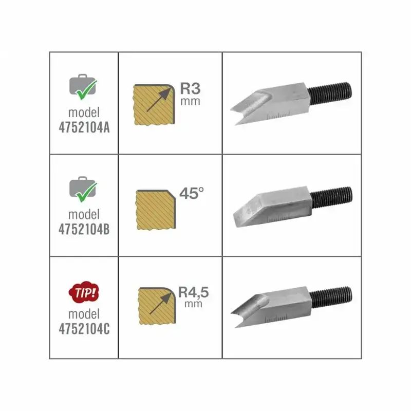 Súčasťou sú 2 profilové nože – skosenie 45° a zaoblenie R3 mm – pre rýchle striedanie medzi fasetou a oblým profilom.