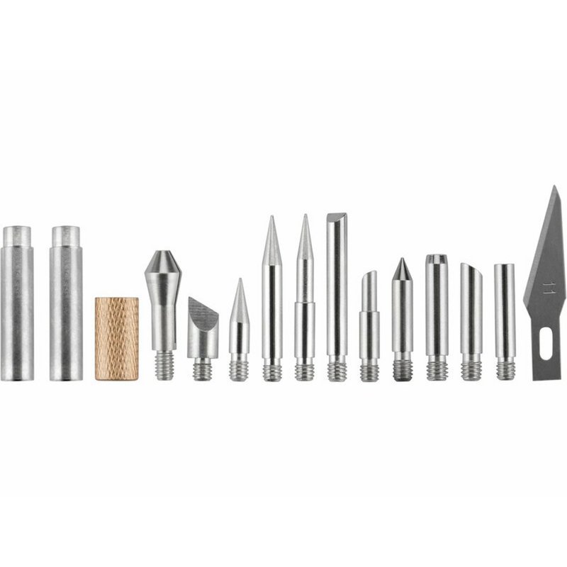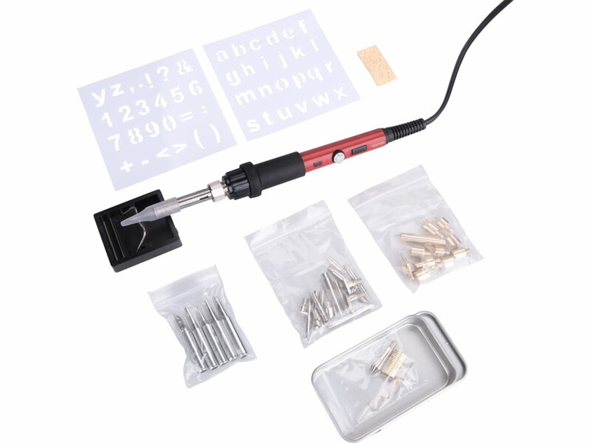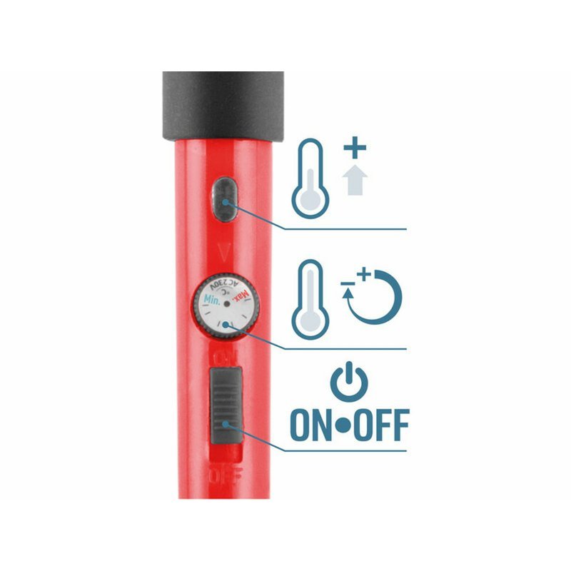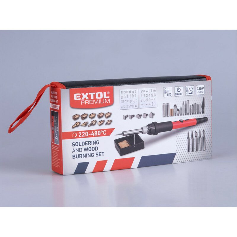 Hrotová spájkovačka EXTOL Premium je navrhnutá na mäkké spájkovanie, ktoré si vyžaduje vysokú presnosť a kontrolu teploty, ideálnu pre prácu s elektronikou a bižutériou. S vhodným hrotom sa dá tiež využiť na vypaľovanie symbolov do dreva, drobné rezanie alebo spájanie plastov. Spájkovačka využíva štandardný hrot typu 900M, ktorý sa nahrieva keramickým telesom. Teplotu je možné nastaviť pomocou regulačného kolieska v rozsahu 220-480°C. Prechod medzi kovovou a plastovou časťou je vyrobený z vysoko tepelne odolného plastu a rukoväť je pokrytá silikónom pre pohodlné držanie. Balenie obsahuje 6 spájkovacích hrotov, 30 hrotov na vypaľovanie do dreva v plechovej krabičke, 2 šablóny na kreslenie písmen a čísel, a jednoduchý stojan na odkladanie spájkovačky, všetko uložené v praktickom mäkkom puzdre. Vypaľovacie hroty sú kompatibilné s akoukoľvek spájkovačkou používajúcou hroty 900M.
