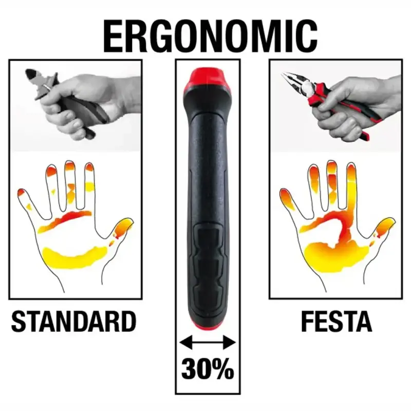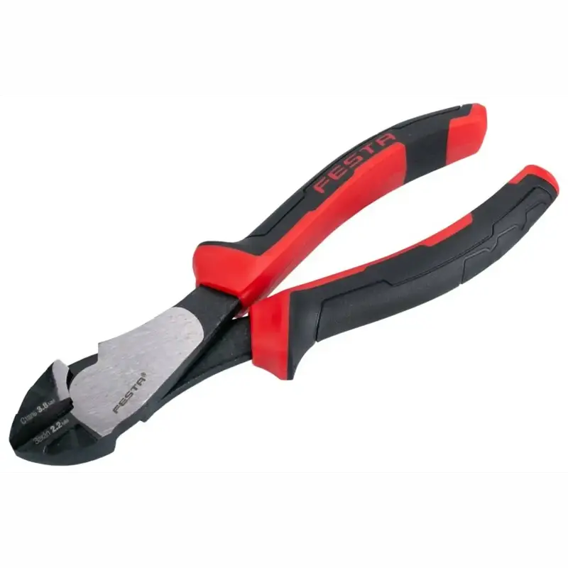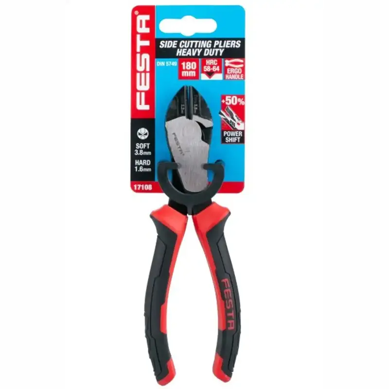 Bočné štípacie kliešte FESTA, kvalitná uhlíková oceľ, zosilnené čeluste, ergonomické rukoväte s certifikáciou pre prácu do 1000 V, antikorózna úprava, výrobca je držitelom certifikátu ISO 9001, blister.
