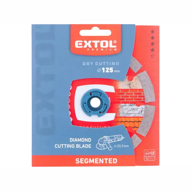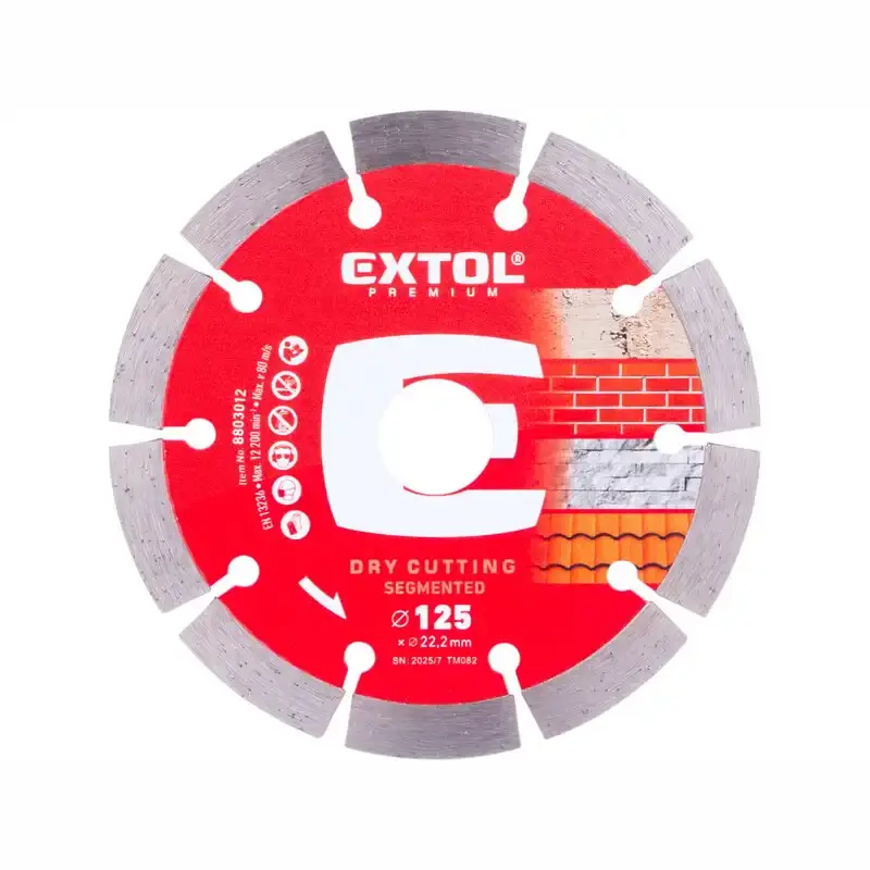 Rezný diamantový segmentový kotúč Extol Premium s priemerom je praktickým doplnkom k náradiu určenému na rezanie stavebných materiálov. Segmentové prevedenie a možnosť suchého rezania z neho robia vhodnú voľbu na presné delenie materiálu podľa odporúčaní výrobcu vášho stroja.