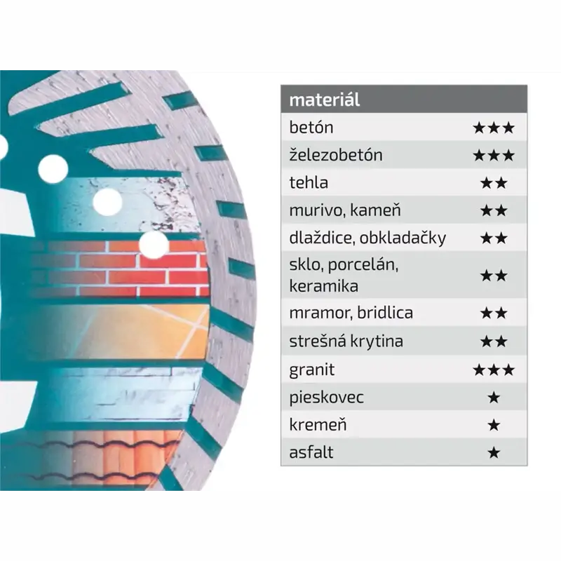 Okrem betónu, železobetónu a žuly je možné kotúč úspešne použiť aj na rezanie tehál, kameňa, dlaždíc, obkladového materiálu, keramiky, mramoru, bridlice a škridly, takže jeden kotúč pokryje široké spektrum úloh na stavbe.Suché aj mokré rezanie podľa typu práce
