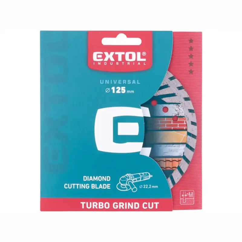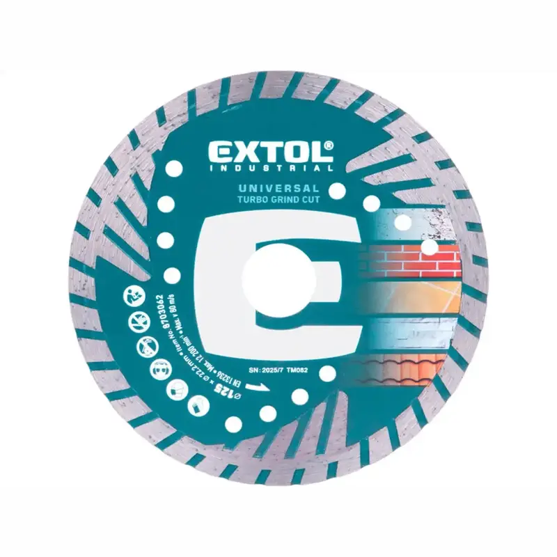 Profesionálny diamantový kotúč EXTOL Industrial Turbo Grind Cut je určený na rýchle a presné rezanie aj drobné zabrusovanie betónu, železobetónu, žuly a ďalších stavebných materiálov. Vďaka špeciálnemu tvaru segmentov, kvalitnému diamantovému osadeniu a možnosti suchého aj mokrého rezania poskytuje vysoký výkon, dlhú životnosť a čistý rez pri každom použití.