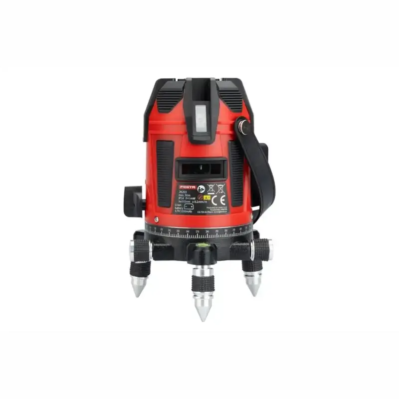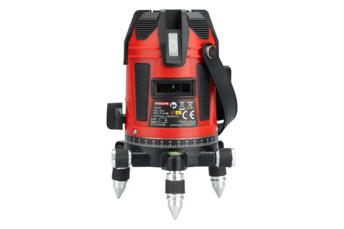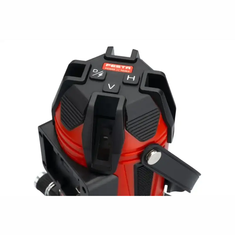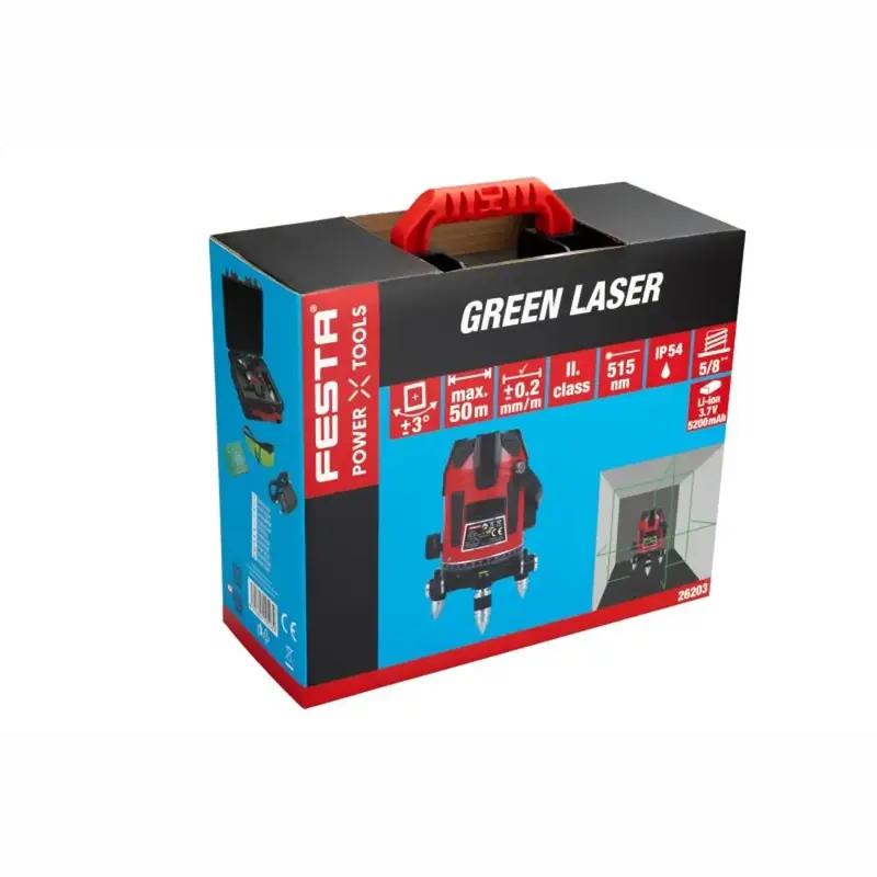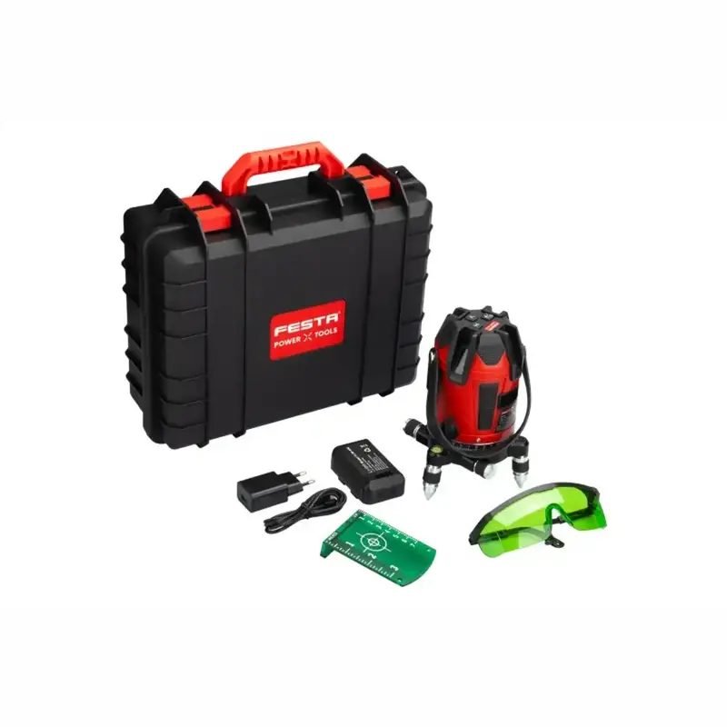 Profesionálny krížový laser FESTA so zeleným lúčom ponúka jednu horizontálnu a štyri vertikálne roviny pre maximálnu presnosť pri stavebných a montážnych prácach. Disponuje funkciou olovnice, samonivelačným systémom a vysokou presnosťou 0,2 mm/m. Zelený lúč zabezpečuje vynikajúcu viditeľnosť aj v horších svetelných podmienkach. Súčasťou balenia je bohaté príslušenstvo vrátane Li-ion batérie, ministatívu a prepravného kufra.