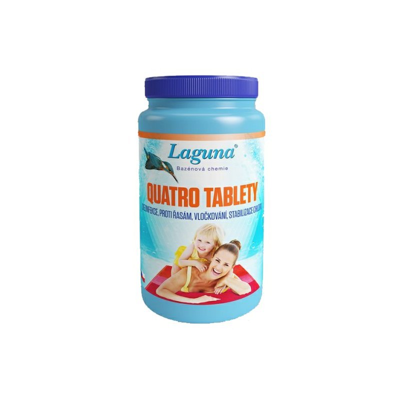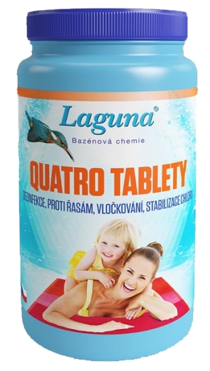 Laguna Quatro (200g tableta) je viacúčelový prípravok určený na pravidelné dezinfekciu bazénovej vody, zabránenie vzniku rias, odstránenie nečistôt pomocou patentných flokulácií a stabilizáciu chlóru. Použitie: Prípravok (4v1) zabezpečuje Stoj dezinfekciu bazénovej vody pomocou patentných pomaly sa uvolňujúceho chlóru, prevenciu proti tvorbe rias, napomáha odstráneniu mikroskopických nečistôt pomocou patentných flokulácií a stabilizuje chlór. Použitím tejto 200g tablety možno ošetriť vodu v bazéne o veľkosti 30 m3 na 5-7 dní pri bežných podmienkach. Návod na použitie: Tableta sa dávkuje do skimmeru, nesmie prísť do priameho styku s obkladmi, stenou a dnom bazéna, aby nedošlo k ich odfarbeniu. Výdatnosť: Pri pravidelnej prevádzke 1 tableta na 30 m3 vody každých 5-7 dní.