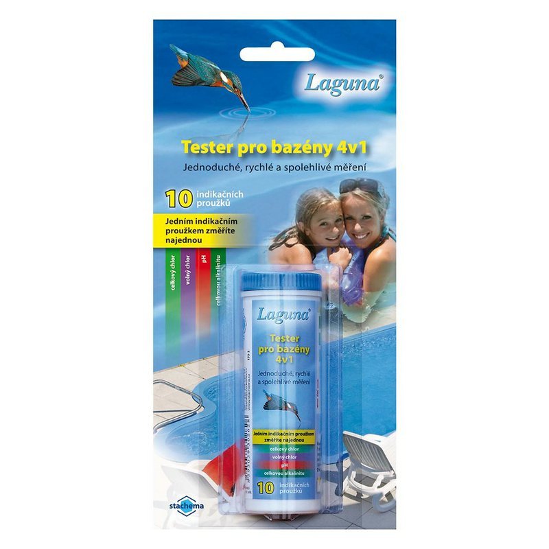 Tester slúži na meranie hodnôt pH, obsahu chlóru (celkového + voľného) a celkovej alkalinity v bazénovej vode. Návod na použitie: jednoduché a spoľahlivé meranie všetkých hodnôt naraz pomocou patentného jedného identifikačného prúžku. Následne sa podľa nameraných hodnôt upraví hodnota pH na rozmedzí 6,8-7,6 prípravky Laguna pH plus alebo Laguna pH mínus a obsah chlóru na hodnotu 0,3-0,8 mg / l prípravky Laguna chlórové tablety, Laguna chlór šok, Laguna mini tablety, Laguna modrý šíp alebo Laguna MINI Triplex tablety, Laguna Triplex tablety, Laguna Quatro tablety Balenie: 10 prúžkov v dózičke pH - vyjadrenie kyslosti alebo zásaditosti vody, optimálna hodnota pH vody v bazéne sa pohybuje v rozmedzí od 6,8 do 7,6 voľný chlór - hlavný nositeľ dezinfekčného účinku, eliminuje mikroorganizmy, napr. baktérie a riasy, odporúčaná hodnota voľného chlóru je 0,3-0 , 8 mg / l celkový chlór - časť celkového chlóru, napr. vo forme chloraminov, je nežiadúci formou chlóru vo vode, hodnota viazaného chlóru v bazéne by sa mala pohybovať max. do 0, 3 mg / l celkové alkalinity - predstavuje súhrn bázických látok rozpustených vo vode, ktoré zabraňujú náhlym zmenám pH, optimálna hodnota celkovej alkalinity sa pohybuje v rozmedzí od 80 do 120 mg / l, má vplyv na účinnosť dezinfekcie, na úpravu hodnôt pH, tvorbu zrazenín rôznych zložiek z vody a na koróziu kovových súčastí