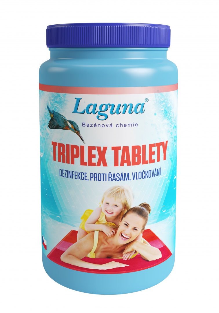 Laguna Triplex: Viacúčelový prípravok (200g tableta) je určený na pravidelné dezinfekciu bazénovej vody. Použitie: Prípravok s trojitým účinkom zabezpečuje stoj dezinfekciu bazénovej vody pomocou patentných pomaly sa uvolňujúceho chlóru, prevenciu proti tvorbe rias a napomáha odstráneniu mikroskopických nečistôt pomocou patentných flokulácií. Použitím tejto 200g tablety možno ošetriť vodu v bazéne o veľkosti 30 m3 na 5-7 dní pri bežných podmienkach. Návod na použitie: Tableta sa dávkuje do skimmeru, nesmie prísť do priameho styku s obkladmi, stenou a dnom bazéna, aby nedošlo k ich odfarbeniu. Výdatnosť: Pri pravidelnej prevádzke 1 tableta na 30 m3 vody každých 5-7 dní.