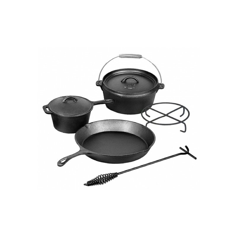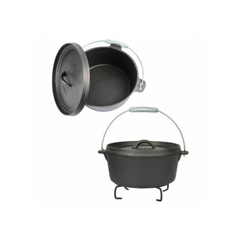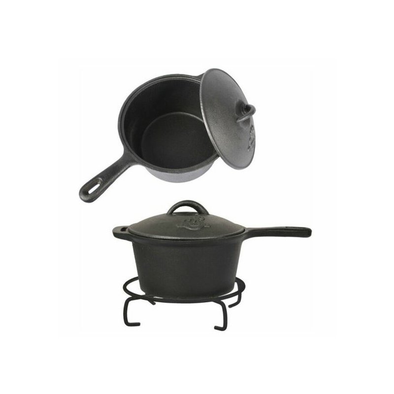 Praktická outdoorová sada liatinového kuchynského riadu pre grilovanie a BBQ obsahuje kotlík, rajnicu, panvicu, podstavec pod hrnce a predĺženú rúčku s hákom. Sada liatinového riadu je výbornou voľbou pre kempovanie, pikniky a záhradné oslavy. Telo nádob z kvalitnej zliatiny zaručuje rovnomerné rozloženie tepla a dlhú životnosť. Tepelne izolovaná rukoväť umožňuje manipuláciu s horúcim riadom, pokrievkou, stojanom, alebo pahrebou. Liatinový riad sa jednoducho používa a čistí, preto je vhodný pre varenie na otvorenom ohni. Robustná konštrukcia a široké možnosti použitia ho predurčujú pre prípravu rôznych jedál, od polievok a omáčok po pečené a grilované pokrmy.