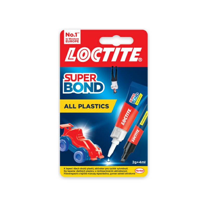 Loctite Super Bond All Plastics 2g+4ml, sekundové lepidlo na plasty. Kvalitné lepidlo na plasty PE, PP, PVC, Plexisklo, ABS, Vinyl, Nylon, tiež na porcelán, kov, gumu, kožu, drevo, papier.