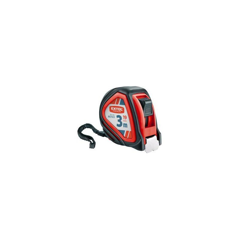 Meter zvinovací, pogumovaný, 1x brzda, 3m, šírka pásu 19mm. Pogumovaný obal pre lepší úchop a odolnosť, veľmi kompaktný vďaka zapustenémupogumovaniu, rozmerné nylonové pútko, posuvný háčik, 2x stop tlačidlo.