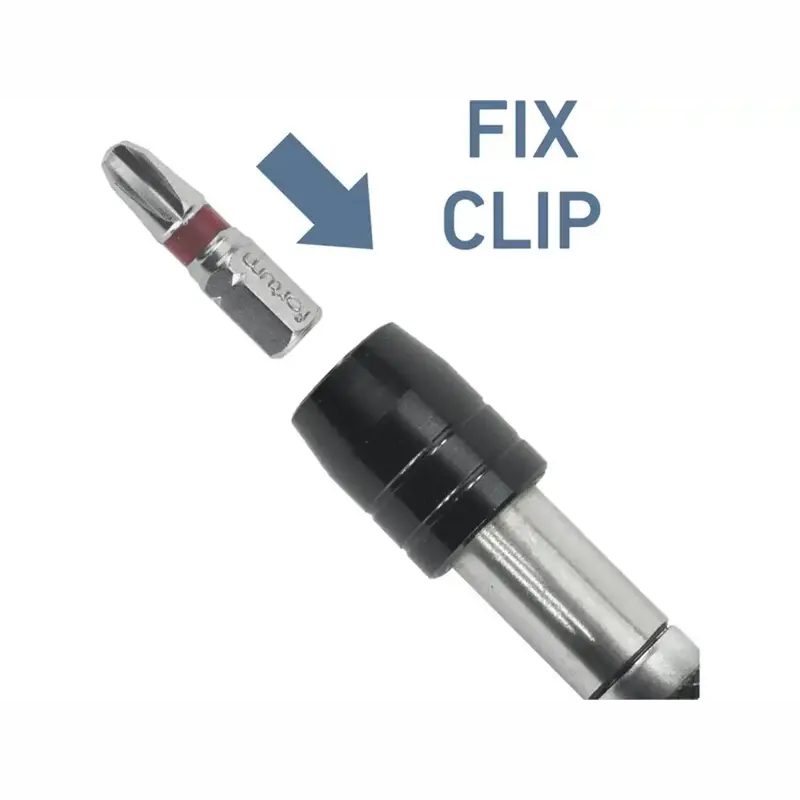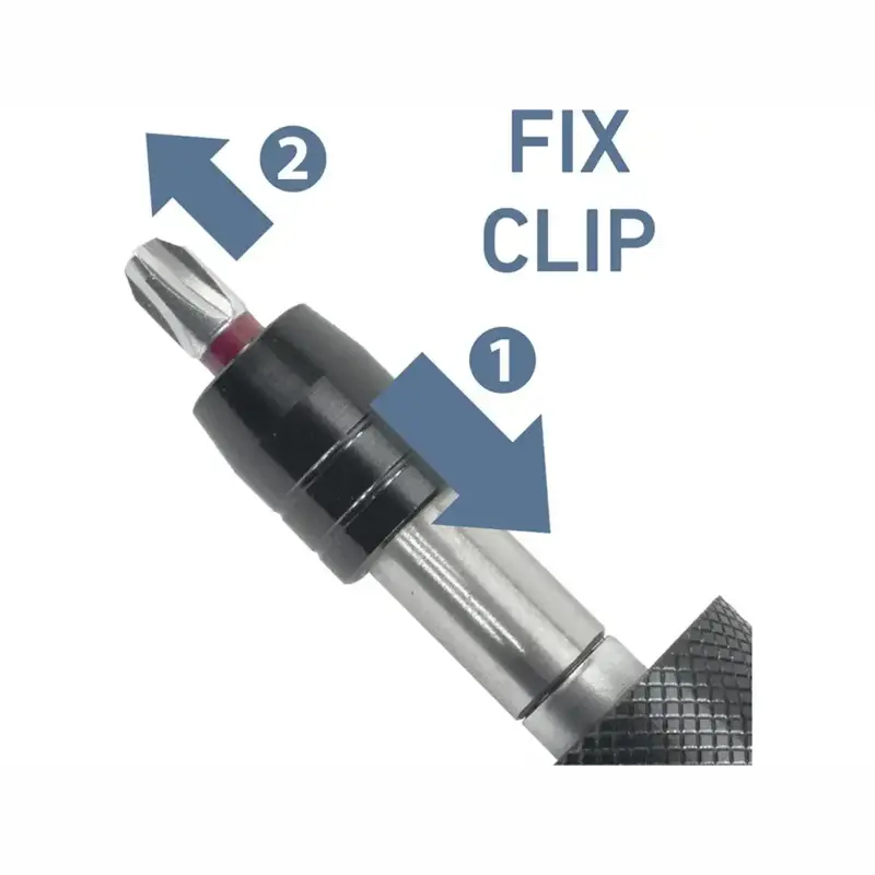 Hrot sa po zasunutí do držiaka pevne zafixuje; na uvoľnenie stačí zatlačiť vonkajší prstenec smerom k rukoväti a hrot vytiahnuť.