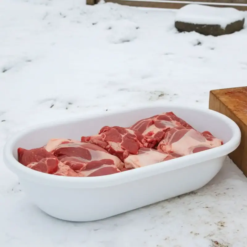 Nádoba na mäso oválna je praktická plastová nádoba s veľkým objemom 150 l, vhodná na kontakt s potravinami. Vďaka oválnemu tvaru a priestranným rozmerom 130 × 68 × 34 cm ponúka dostatok miesta na spracovanie a dočasné skladovanie mäsa v domácnostiach aj prevádzkach.
