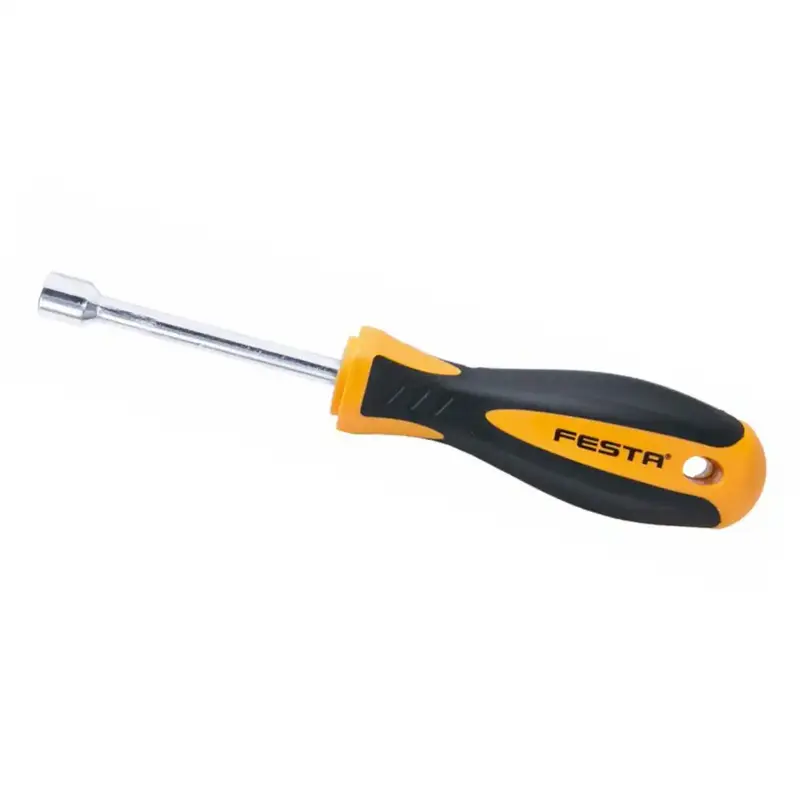 Nástrčný skrutkovač FESTA má kovový driek s nadstavcom vyrobený z veľmi kvalitnej chrómvanádiovej ocele , povrchovo chránený tvrdochrómom, kombinácia polypropylénu a gumy na ergonomicky tvarovanej rukoväti zaručuje výborné antisklzové vlastnosti a dobrú odolnosť voči mazadlám a chemikáliam.