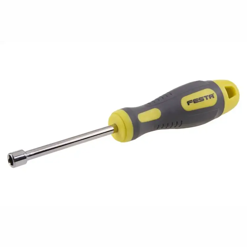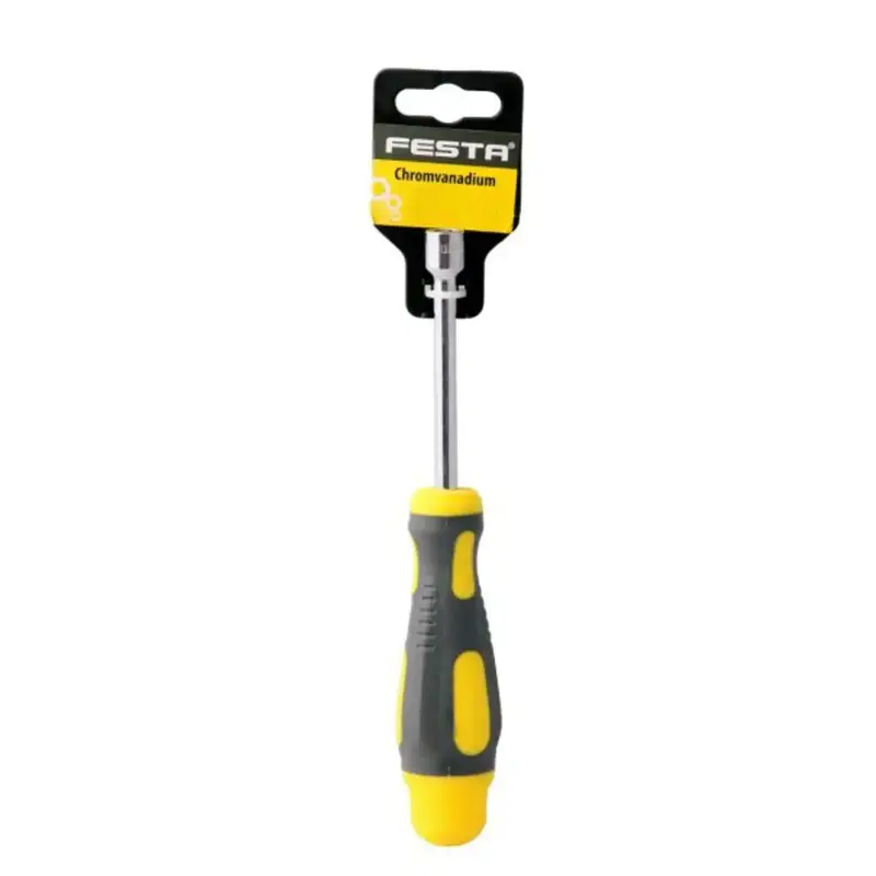 Nástrčný skrutkovač FESTA má kovový driek s nadstavcom vyrobený z veľmi kvalitnej chrómvanádiovej ocele , povrchovo chránený tvrdochrómom, kombinácia polypropylénu a gumy na ergonomicky tvarovanej rukoväti zaručuje výborné antisklzové vlastnosti a dobrú odolnosť voči mazadlám a chemikáliam.